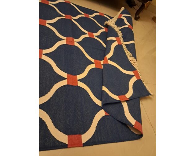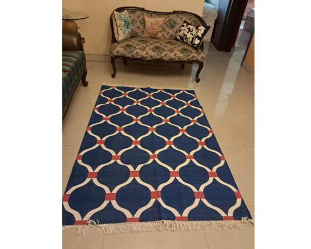 Add elegance to your space with this handwoven cotton rug in a striking regal blue. Featuring bold geometric patterns in white and red, it’s perfect for living rooms, bedrooms, or entryways.
